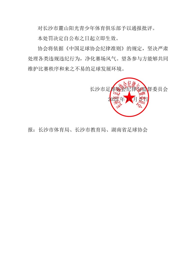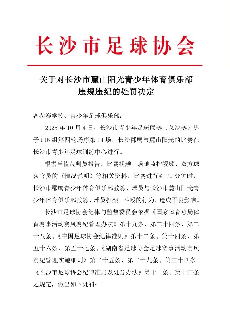 关于对长沙市麓山阳光青少年体育俱乐部违规违纪的处罚决定