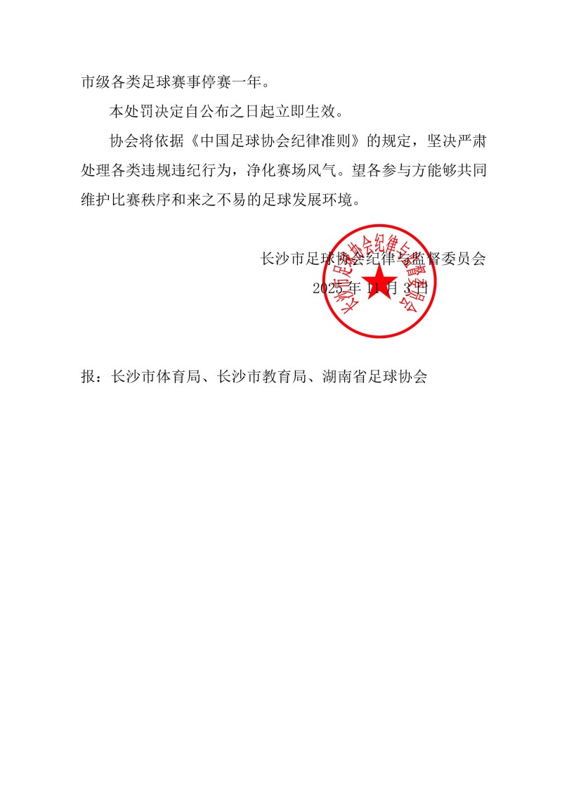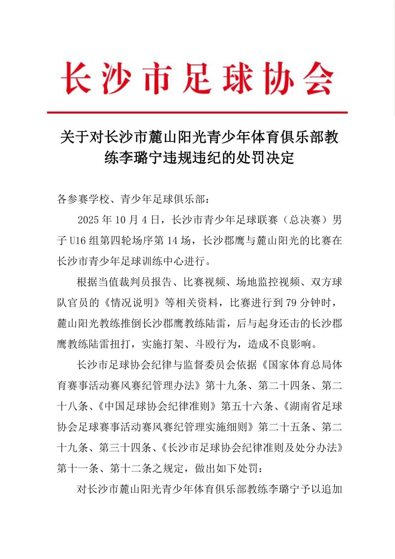 关于对长沙市麓山阳光青少年体育俱乐部教练李璐宁违规违纪的处罚决定