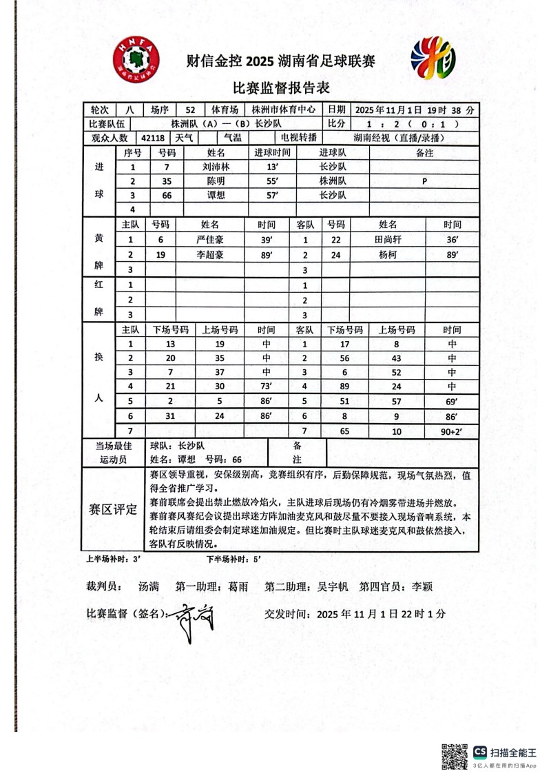 第八轮第52场,株洲VS长沙,比赛监督报告